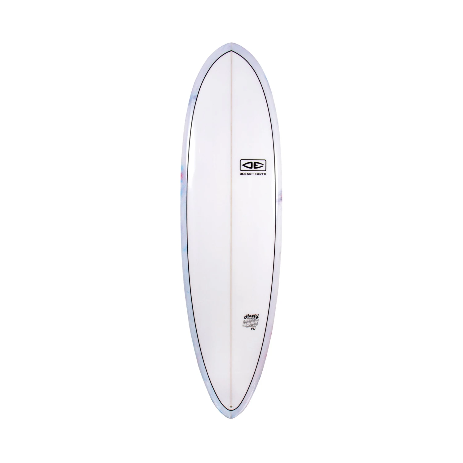 Our happiest surfboard yet, the Happy Hour PU 6’6″ is designed for both fun and performance, making wave catching and maneuverability a breeze. Constructed using a lightweight polyurethane core and PU glass, adding extra responsiveness and speed making it the highest performance board in the Happy Hour range. The narrower tail shape and fuller nose combine to create a super versatile surfboard.  The different fin combinations allow the board to be surfed at different performance levels and waves.