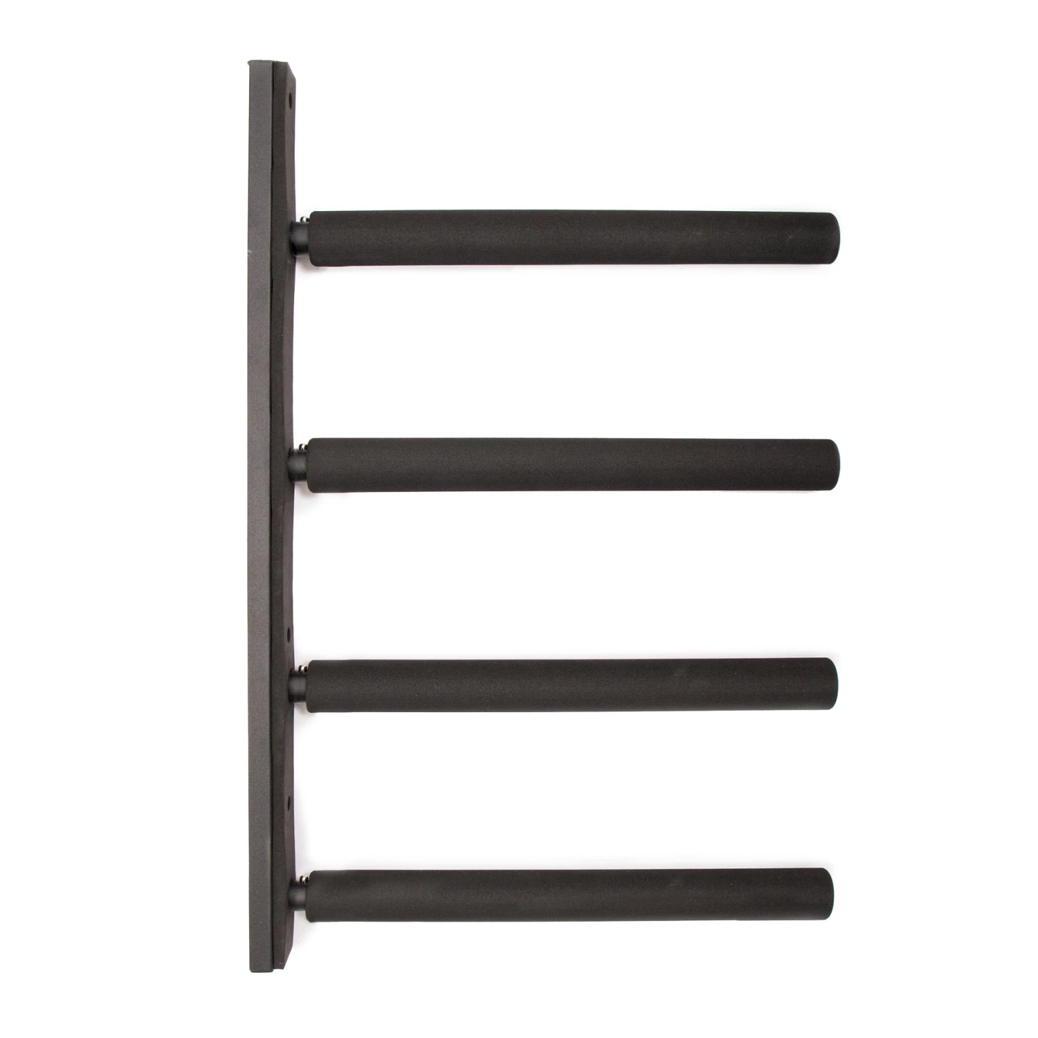 Protect and store your boards with the Surfboard Stack Rack. Featuring a heavy-duty metal frame and 50mm soft protective EVA padded sleeves to protect your sticks. This surfboard rack holds 4 boards and is easily mounted onto the wall with the hardware pack and instructions provided. Comes as one single rack, meaning you can stack 4 boards vertically. Paired with the Eva Padded Floor Mat, you have the perfect storage system for your quiver.